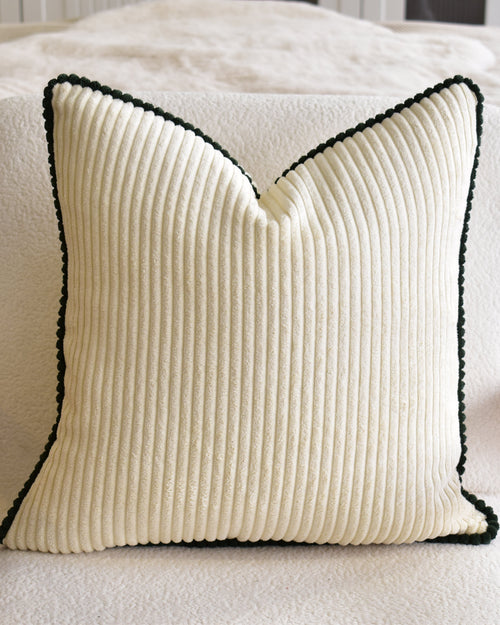 Çam Yeşili Biyeli Kırık Beyaz Fitilli Kadife Kırlent Kılıfı